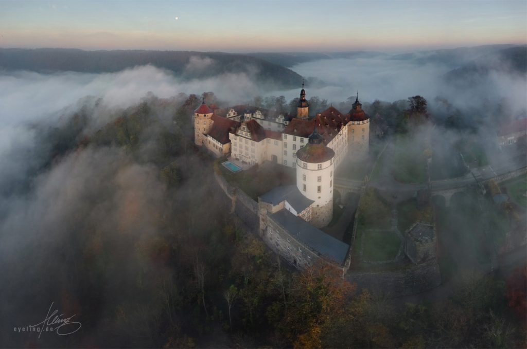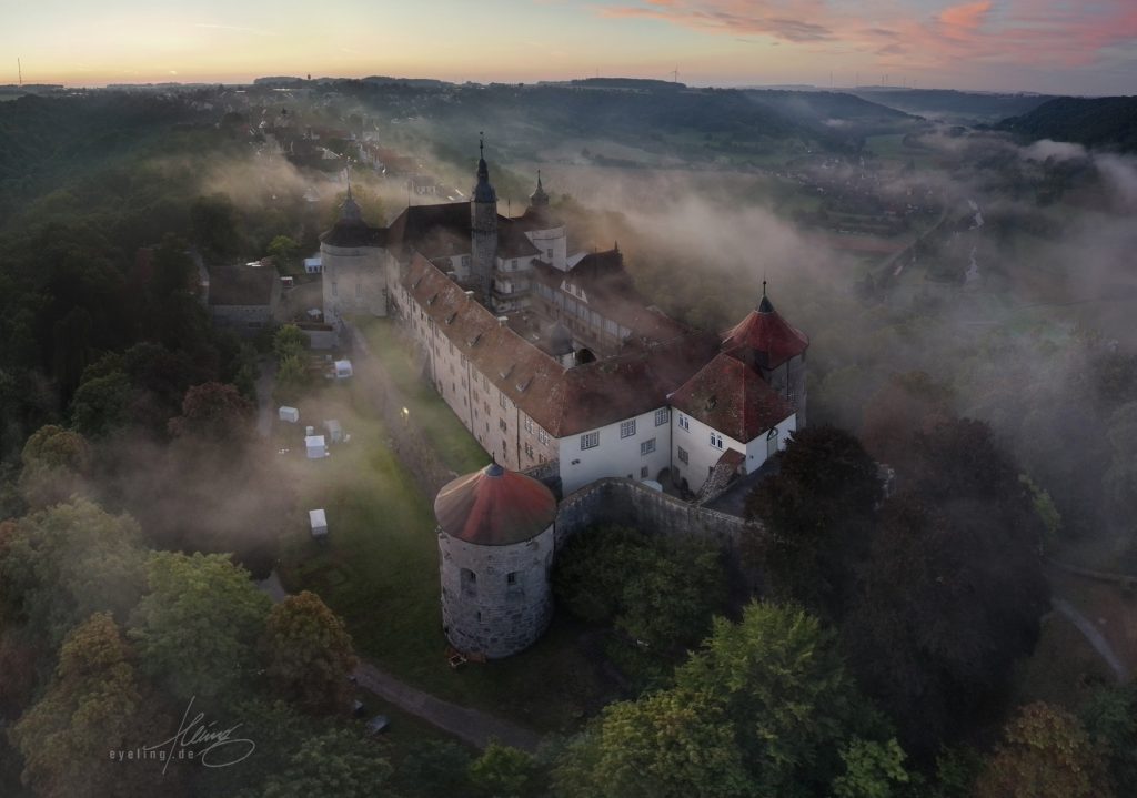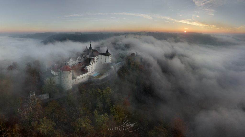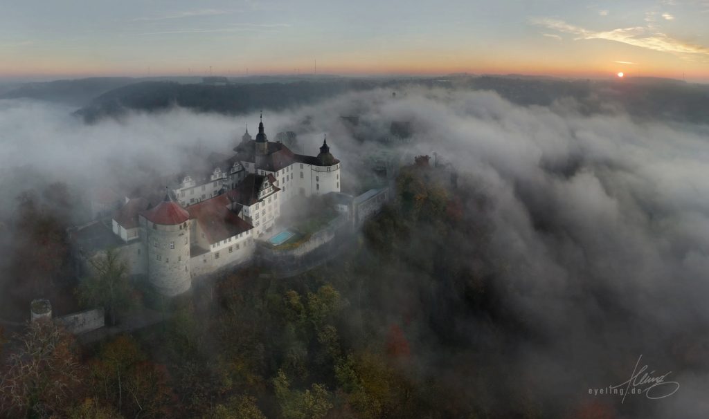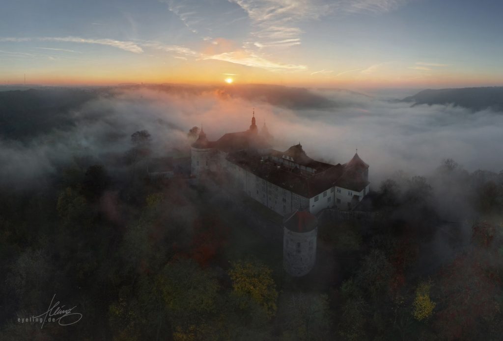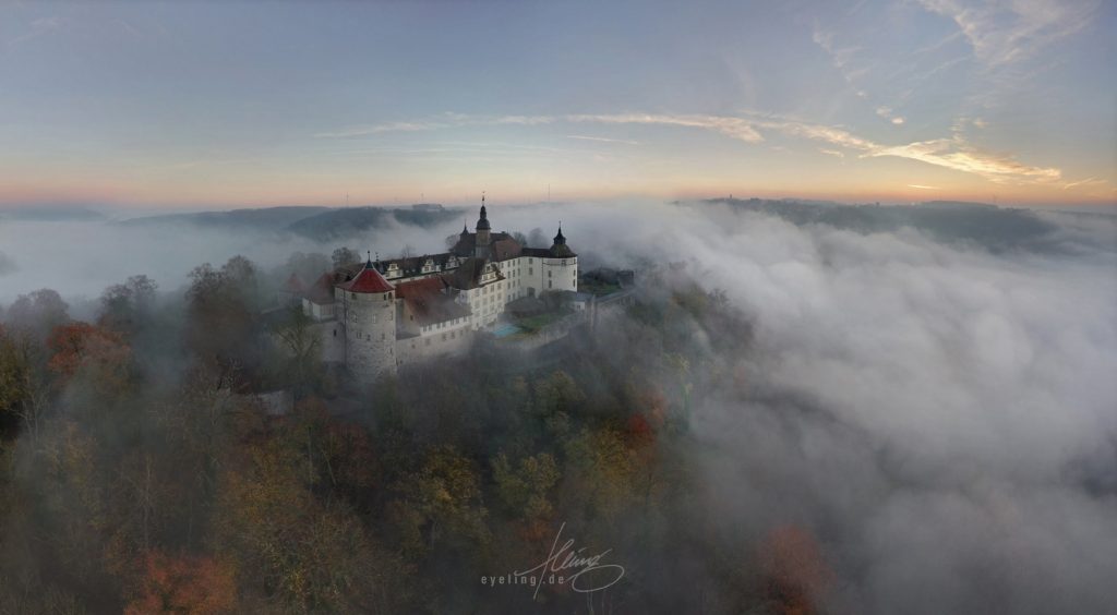 Schloss Langenburg Anfang September, die Zelte der fürstlichen Gartentage sind noch nicht abgebaut. Die zarten Nebelschwaden geben den Blick auf das Jagsttal frei. Der Himmel voll grandioser Pastellfarben musste tatsächlich abgeschnitten werden, weil er die Gesamtwirkung überfrachtet hätte. Das obige Bild ist kein Einzelfoto, sondern ein Panorama aus zwölf Aufnahmen. Nach weiteren Übungen über die nächsten Wochen ließ sich das auf bis zu 40 Aufnahmen für ein Panorama steigern. Dabei geht es nicht nur um Pixelmaximierung, sondern auch um die bewusste Ausnutzung der damit verbundenen Verzerrungseffekte. Das schafft Spannung und einen gesteigerten Eindruck von Weite. Automatische Panorama-Funktionen funktionieren je nach Drohnenmodell mäßig bis gut, lassen allerdings wenig Einflussmöglichkeiten. Deshalb erstelle ich Panoramen immer manuell am Rechner, nicht mit der internen Automatik der Drohne selbst. Nach einigen erfolglosen Morgenflügen harmonierten Anfang November Nebenhöhe und -dichte mit einem freien Himmel. Die Sonne ist gerade hoch genug über dem Horizont, um sich im aufsteigenden Dunst zu brechen. Die Wogen von Nebel branden aus dem Jagsttal an die Schlossmauer.