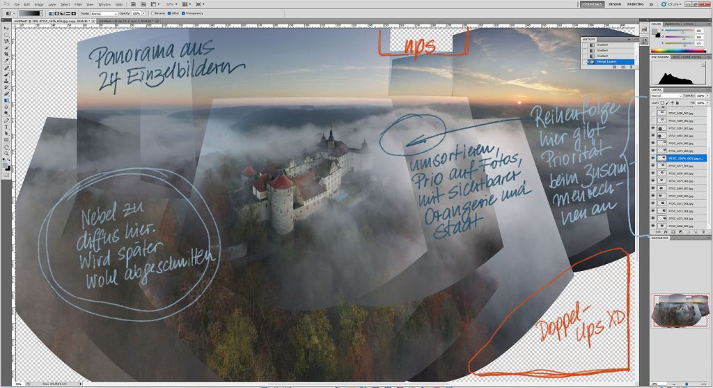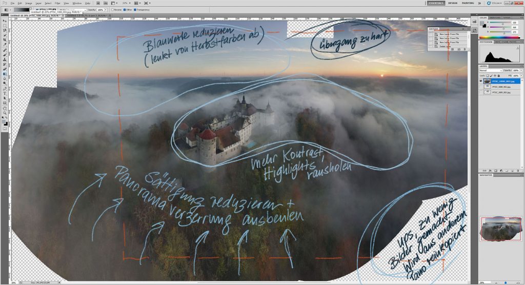Mit noch mehr Bewegung statt Farbe arbeitet eine Ansicht, die wenige Minuten vorher entstand:Das Bild oben zeigt fertig zusammengefügtes, nachbearbeitetes und beschnittenes Panorama aus 24 Einzelfotos in drei Reihen. Der Prozess dahin: Die (Haupt)kamera von Drohnen ist häufig ein Weitwinkel ums 25mm-Äquivalent. Für ausladende Motive muss oft etwas Distanz aufgebaut werden. Das ist nicht immer rechtlich möglich oder situativ klug. Im konkreten Fall hier ging es auch darum, die Pixelzahl des Gesamtbildes zu erhöhen, um Unschärfen und Bildrauschen durch Runterrechnen auszugleichen. Meine Drohne gehört ins günstigste Preissegment. Extreme Lichtkontraste innerhalb eines Einzelfotos (wie hier Gebäude im Gegenlicht) überfordern die Automatik, die RAW-Qualität ist dürftig. Deshalb wurde jedes Foto als 5-Stufen-Belichtungs-Bracketing geschossen und manuell zusammengesetzt, bevor es zum Panorama-Puzzleteil wurde. Das Bildbearbeitungsprogramm automatisiert das Zusammensetzen, braucht aber Erfahrung: Photoshop orientiert sich an den untersten Fotos des Stapels zur Auswahl der passendsten Segmente aus den Bildern darüber, trifft zuweilen eigenwillige Entscheidungen für Belichtungsausgleiche. Am Bildschirm sieht das dann so aus:Die Andeutung des Gesamtbilds wirkt schon brauchbar. Wenn nur nicht irgendwer den Aufnahmewinkel falsch eingeschätzt hätte, wodurch 1-2 Fotos für die untere rechte Ecke fehlen. Mist. Aber bei dieser Distanz ist es kein Problem, Nebelwald und Himmelssegment aus anderen Panoramen zu borgen. Also werden die Einzelfotos verschmolzen und das neue Gesamtbild weiterbearbeitet:Tonnenförmige Panoramen verzerren stark an den Rändern, aber der Wald war wetterbedingt eh diffus, die manuelle Entzerrung dieses Bereiches opferte also wenige Details. Auch war der linke Rand eher uninteressant, weshalb das Bild nach rechts zugeschnitten wurde und das Schloss vom Zentrum in die linke Bildhälfte rückte. Danach folgten nur noch wenige Farb- und Kontrastanpassungen. Scheinbar unaufällig, aber sehr wichtig war die Reduzierung der Blauwerte für den Himmel. Das verfremdet zwar die natürlichen Verhältnisse bei der Aufnahme, wirkt aber beruhigend fürs Auge und betont die Herbstfarben.Im fertigen Panorama ist der Nebel dynamischer, mehr Details des Waldes sichtbar und auch der Blick auf einzelne Bauten der Altstadt wird freigegeben. Zeitgleich mit dem leicht erhöhten Kontrast wurde die Rot-Sättigung minimal zurückgenommen – die Schlossdächer wirken so natürlicher.